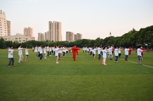 与此同时,在西校区运动场上,由专业队员带领的太极操也集体开场:他们神采奕奕,英姿飒爽;他们步伐稳健,动作标准;他们刚劲有力,心随拳走。同学们矫健的身影,稳健的步伐,优美的动作吸引了很多观众的驻足观看。当被问及此次活动的意义何在时,小管同学这样说道:“首先,我认为这是一个锻炼身体的好机会。平时一直坐在位子上,很容易生病,有机会出来运动运动是非常好的。同时我也认为此次活动有利于全民健身。”一招一式,动静结合,刚柔并济,同学们在领略太极独特魅力的同时,也抓住到了运动的精髓。