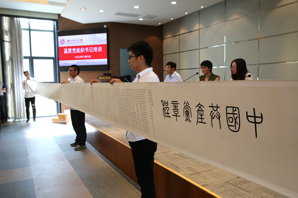 会议表彰了2016年学校党建和思政研究优秀论文、“十三五 话担当”微党课比赛获奖人员、“两学一做”全省大学生知识竞赛优秀组织奖获奖单位等。据悉,经各二级党组织积极宣传发动,全校共有6604名学生参加了“两学一做”全省大学生知识竞赛,参与率名列全省高校第3位,学校获优秀组织奖。会上,理学院党委书记王海华向学校赠送了耗时两个月精心创作的绢书作品《中国共产党章程》,黄建平代表学校为其颁发了作品收藏证书。