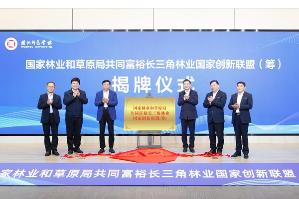 揭牌仪式上,金佩华代表学校向各位领导、嘉宾表示热烈的欢迎!向给予共同富裕长三角林业国家创新联盟筹建工作大力支持的各有关单位致以诚挚的谢意。他指出,学校始终牢记习近平总书记主政浙江期间来校视察时对学校提出的“因地制宜、体现特色、服务地方”殷殷嘱托,以“三个一定”的办学目标为指引,牢牢抓住高等教育发展机遇,一张蓝图绘到底,一任接着一任干,各项事业实现了高质量跨越式发展。近年来,学校积极对接长三角一体化发展国家战略,主动服务浙江高质量发展建设共同富裕示范区,全力助推湖州创建生态文明典范城市,努力打造城市与大学命运共同体,涉农涉林学科建设和人才培养等进步明显。他强调,学校作为共同富裕长三角林业国家创新联盟的牵头筹建单位、理事长单位和秘书处,将举全校之力,全方位支持创新联盟的筹建和发展,希望联盟能立足南太湖、服务长三角、辐射全中国,加强校内外、省内外的协同创新,充分整合长三角区域相关高校、科研院所及企业等单位的资源和力量,总结“共富”经验、讲述“两山”故事、发掘林业新价值、探索共富新模式,力争将联盟建设成为特色鲜明、复合交叉、示范引领的新型高端智库、科技创新平台、示范推广网络和人才培养基地。