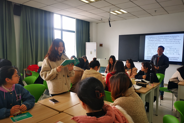 “英语教学需要让学生积极参与到语言情境之中,我在上课时尽量引导学生自主参与和探究。”段自力在任教的班级划分了学习小组,把课堂互动与课外实践活动相结合、组内评价和组间评价结合,使课前、课中、课后全过程形成学习活动及其评价结果一体化,也有效地调动了学生的积极性、主动性。他不断研究和创新教学方法,设计了一些有趣的小组合作学习活动,如“制作讲述中国故事短视频”和“我为国家领导人做翻译”的时政翻译活动,引导学生将专业知识与社会现实相结合,学会交流合作,运用基本翻译知识解决复杂的翻译问题。