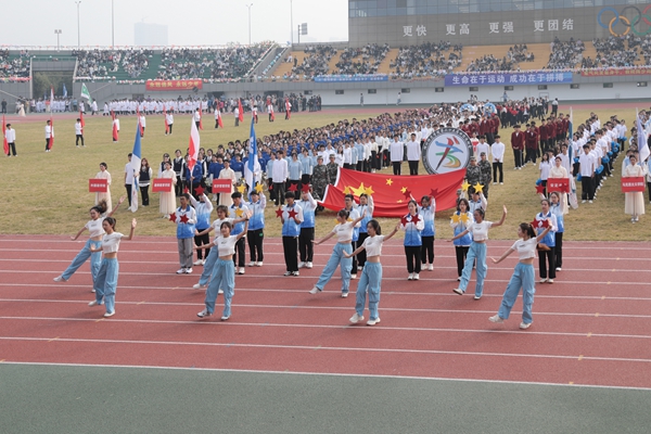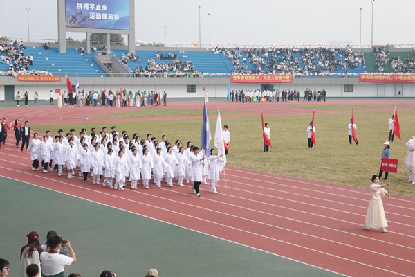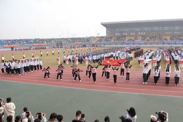 伴随着雄壮的《运动员进行曲》,国旗护卫队、校运动会会徽队以及全体裁判员、运动员迈着整齐的步伐,精神饱满地步入运动场。各代表队的方阵依次走过主席台前,向师生们展现着青春风采。