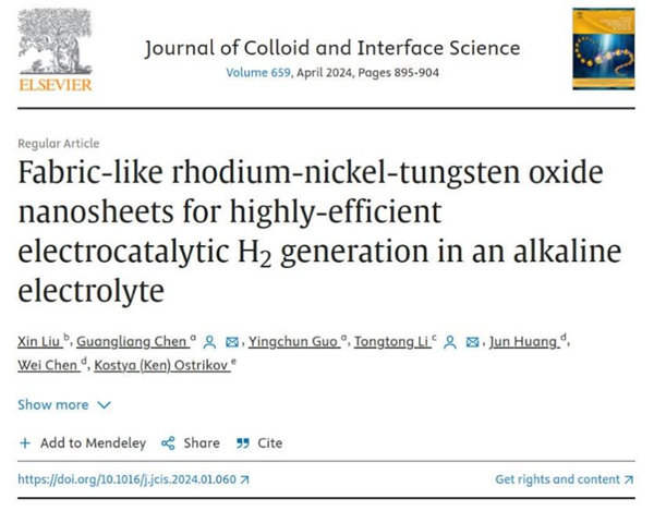 近日,我校工学院材料科学与工程系陈光良教授(第一通讯作者)以我校为第一单位在化学领域知名期刊《Journal of Colloid and Interface Science》(中科院一区TOP,IF:9.9)上,发表题为 “Fabric-like rhodium-nickel-tungsten oxide nanosheets for highly-efficient electrocatalytic H2 generation in an alkaline electrolyte” 的研究文章。