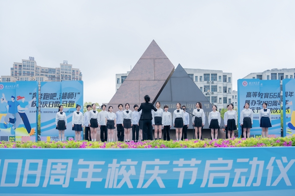 仪式上,校合唱团的学生们演唱《久久精品一区二区校歌》《生日快乐》,共同祝福湖师生日。