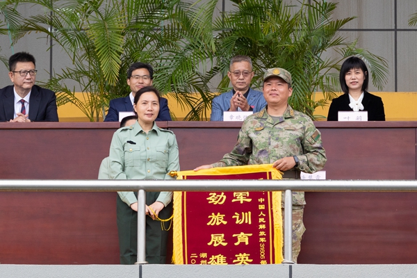 许慧霞向军训教官和教导员代表赠送荣誉奖章,向承训部队赠送锦旗。她代表学校向承训部队表示感谢,向从事军训组织和保障工作的各位老师致以诚挚问候,向2024级全体新生表示祝贺。她充分肯定同学们在军训过程中的出色表现,并希望大家心有所向,在担当中实现个人价值,把对国家的大爱化作我们日常生活中的点滴实际行动;信有所依,在陪伴中走好成长之路,相互支持,团结协作,共同为实现我们的目标和梦想而努力奋斗;行有所至,在磨砺中擦亮青春底色,强健体魄,锤炼意志,为今后几十年的健康学习工作生活打下坚实基础。
