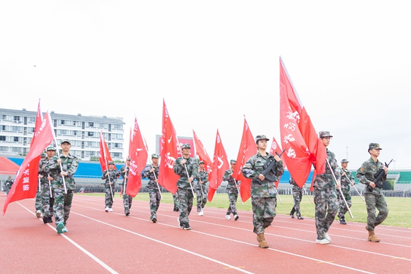 分列式表演中,旅旗和各营营旗组成显赫军旗方阵,紧随其后的是本次军训首次亮相的持枪方阵,由经济管理学院64名学生组成,他们肩扛时代重任,以军人的飒爽英姿,展现了当代青年的蓬勃朝气和风采。随后,各学院组成的方阵依次经过主席台接受检阅。他们步伐整齐,口号嘹亮,每一个方阵都犹如一支训练有素的军队。他们以昂扬的斗志、饱满的精神,向全校师生展示着新时代大学生的风采与活力。