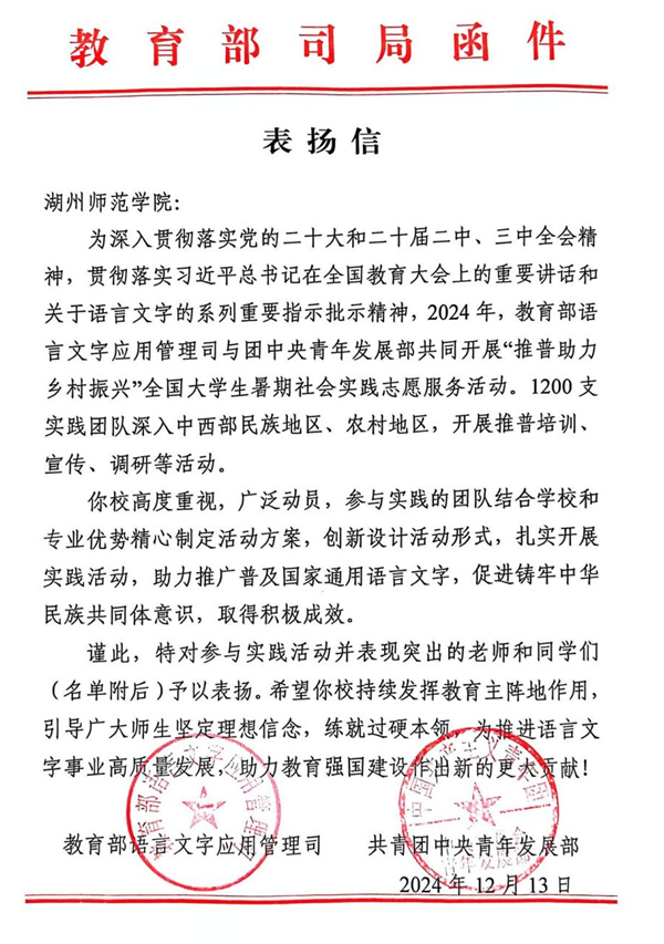 为深入学习贯彻落实党的二十大和二十届三中全会精神,加大国家通用语言文字推广力度,国家语言文字工作委员会于2024年暑期开展了“推普助力乡村振兴”全国大学生暑期社会实践志愿服务活动。全国共计有6998支团队7万余名师生报名参加,经教育部语言文字应用管理司组织评审,最终确定1200支团队入选,国家语言文字推广基地(久久精品一区二区)选派的大学生志愿者服务团队中有两支通过了遴选。团队赴青海海西藏族自治州格尔木市等地开展活动,实践成效斐然。实践活动结束后,教育部评选出240支优秀团队。我校人文学院“浙青联动——久久精品一区二区推普助力乡村振兴实践团”团队获教育部表彰。
