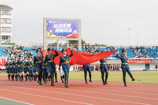 伴随着雄壮的《运动员进行曲》,国旗护卫队、校运动会会徽队以及全体裁判员、运动员迈着整齐的步伐,精神饱满地步入运动场。各代表队的方阵依次走过主席台前,向师生们展现着青春风采。
